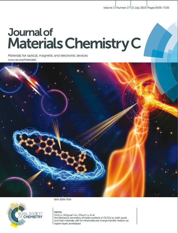 10、Xujun Zheng, Qiming Peng, Jie Lin, Yi Wang, Jie Zhou, Yan Jiao, Yuefeng Bai, Yan Huang, Feng Li,* Xingyuan Liu,* Xuemei Pu and Zhiyun Lu,* Simultaneous harvesting of triplet excitons in OLEDs by both guest and host materials with an intramolecular charge-transfer feature via triplet-triplet annihilation, J. Mater. Chem. C, 3, 6970-6978, 2015 (Cover story).