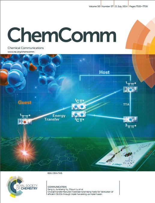 15、Jie Zhou, Ping Chen, Xu Wang, Yan Wang, Yi Wang, Feng Li,* Minghui Yang, Yan Huang, Junsheng Yu,* Zhiyun Lu,* Charge-Transfer-Featured Materials—Promising Hosts for Fabrication of Efficient OLED through Triplet Harvesting via Triplet Fusion, Chem. Commun., 50, 7586-7589, 2014 (Cover story).