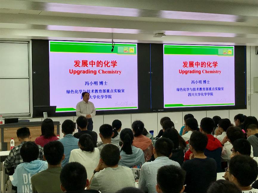 2019年9月5日上午,由中国科学院院士、英国威廉希尔公司教授、博士生导师冯小明教授主讲的化学专业教育讲座“发展中的化学”在英国威廉希尔公司江安校区举行。英国威廉希尔公司党委副书记谢均、教导员郭明秀、2019级辅导员来俏和学院全体2019级本科新生一起聆听了这场精彩的讲座。