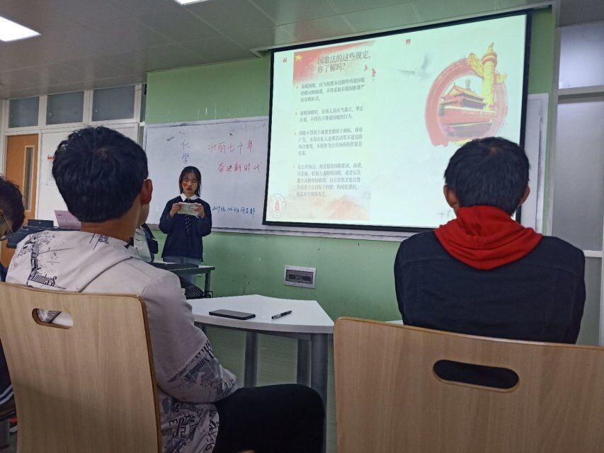 活动分为四个环节。在“青春献歌”环节,同学们全体起立,庄严地齐唱国歌、团歌。以国歌为引子,团支书带领大家学习了国歌、国旗、国徽的历史、精神内涵以及相关法律法规。