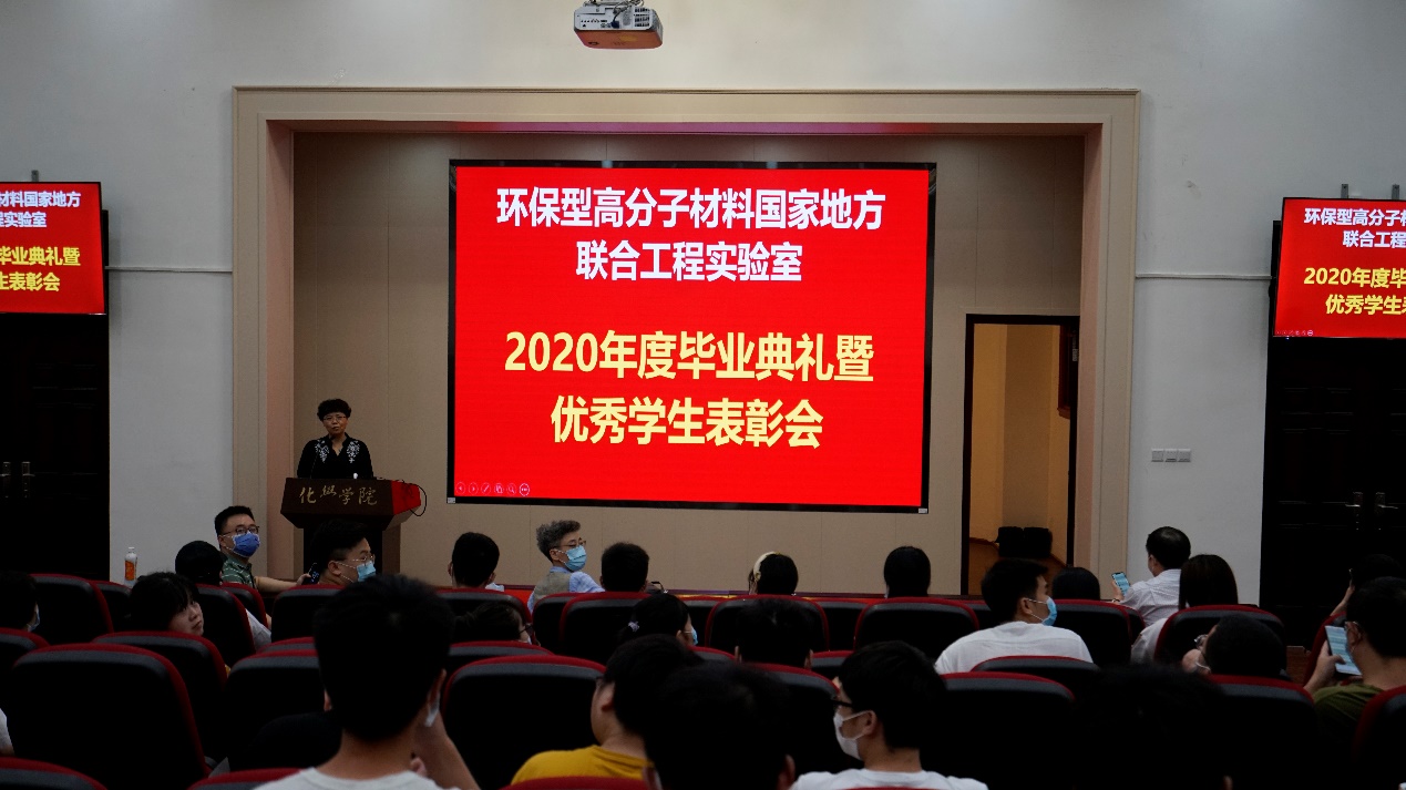 2020年6月21日下午四点,我院环保型高分子材料国家地方联合工程实验室(简称环保实验室)2020届毕业典礼暨优秀学生表彰大会在化学馆321报告厅隆重举行。会议由实验室党支部书记汪秀丽教授主持。为遵守防疫相关规定,我室全体师生相互保持距离就坐,并佩戴口罩参加了此次大会。