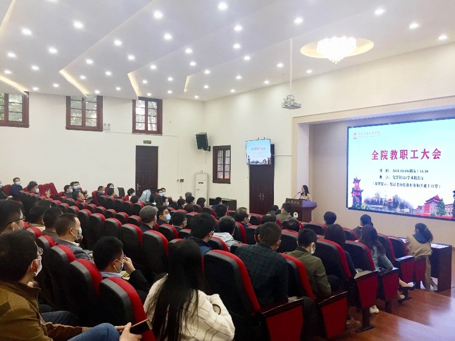 首先,谢均总结了上半年学院的工作,向全院教职工传达了下半年和下一阶段学校、学院的工作重点。上半年新冠肺炎疫情防控和学院各项事业发展均取得了积极的工作成效。下半年我院工作思路是坚持党的全面领导,坚持稳中求进工作总基调,持续统筹推进常态化疫情防控和学院稳步发展,坚持两手抓、两促进,努力做好学院各项工作。大会上,谢均向老师们介绍了今年新进的教职工,对他们的加入表示热烈的欢迎,并对今年退休的教职工表示感谢!另外,谢均将学院的学生工作情况向老师们进行了通报,也进一步强调了全面从严治党和党风廉政教育永远在路上,希望每一位老师时刻牢记,在科研经费使用,抵制学术不端等方面严格要求,守牢底线。