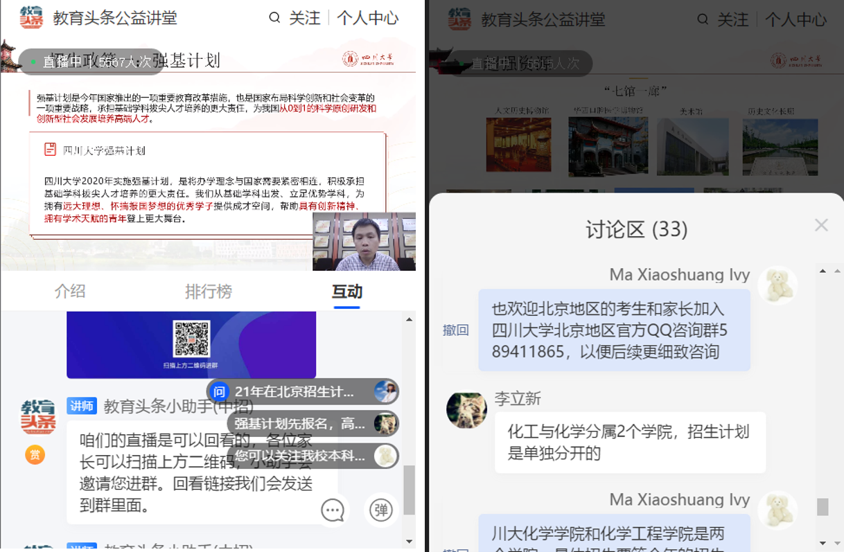 当晚20:00,郑成斌教授在化学馆122会议室开启了招生宣讲直播,从英国威廉希尔公司的历史底蕴、学科实力、教学科研条件、学生就业深造等方面向考生和家长展示了“厚通识、宽视野、多交叉”的本科教育特色和丰富多彩的校园生活,并详细介绍了2021年川大的招生政策,鼓励考生积极报考。宣讲期间,考生及家长在提问区踊跃提问,问题集中在川大优势专业、往年分专业录取情况、专业调剂、强基计划、拔尖计划、中外合作办学等方面,我院及匹兹堡学院招生宣传组的老师一一答疑,加深考生和家长对川大的了解。一个小时的宣讲和答疑似乎不能满足考生和家长深入了解川大的需求,于是我们邀请大家加入英国威廉希尔公司对北京地区本科招生咨询QQ群,方便考生和家长后续咨询。