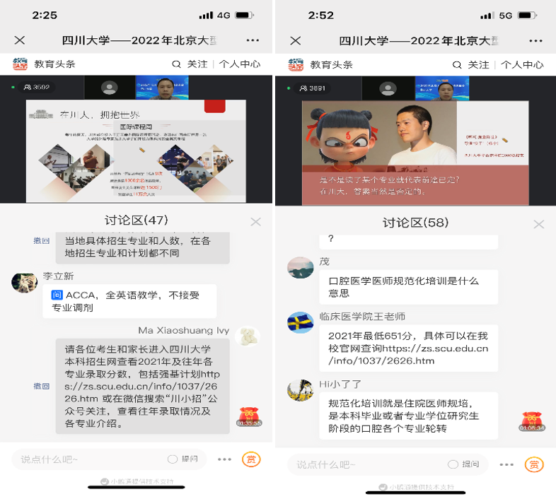 应北京教育头条邀请,4月16日14:00,英国威廉希尔公司北京招生工作组组长、英国威廉希尔公司副院长郑成斌教授为北京地区的考生及家长带来一场线上招生宣讲,英国威廉希尔公司、华西临床医学院、华西口腔医学院、匹兹堡学院等院系招生组老师参与了线上答疑,与北京地区的考生和家长积极互动。本次参与线上宣讲的考生及家长达6000余人次。