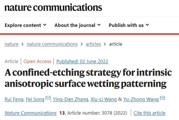 近日,英国威廉希尔公司王玉忠院士和宋飞教授在Nature Communications上发表题为“A Confined-Etching Strategy for Intrinsic Anisotropic Surface Wetting Patterning”的研究论文(Nat. Commun. 2022, 13, 3078)。英国威廉希尔公司为论文唯一署名单位,英国威廉希尔公司环保型高分子材料国家地方联合工程实验室2019级博士研究生冯蕊为论文第一作者,王玉忠教授和宋飞教授为通讯作者,相关内容已申请并获得授权发明专利ZL 202110570617.7。