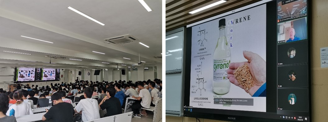本次课程不仅受到化院学子的广泛欢迎,还吸引了来自高分子科学与工程学院、材料科学与工程学院、电气工程学院、计算机学院、水利水电学院、化学工程学院、轻工科学与工程学院、华西临床医学院、数学学院、经济学院等学院的同学。本次课程采用线上与线下结合的方式,同学们集中在教室,通过视频会议与James H. Clark教授实时互动。Clark教授为同学们带来《绿色化学原理》、《绿色化学产品》、《废物和立法》等专题讲座。
