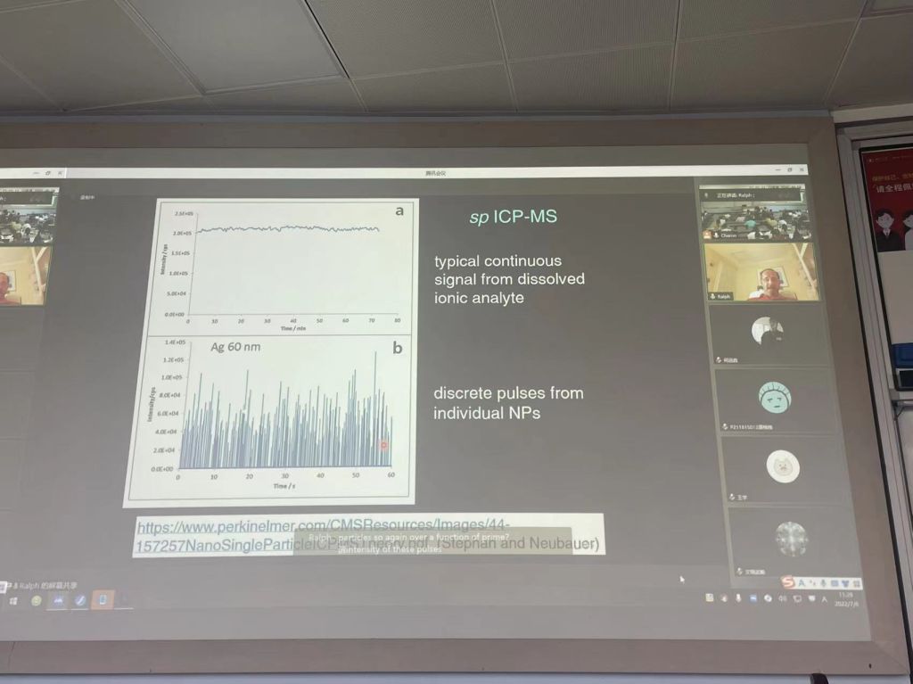Sturgeon教授本次的授课内容主要包括两个部分:(1)等离子体激发源特性:包括各种温度和电子密度参数的介绍以及如何通过光谱测定这些参数。(2)样品引入方式:主要介绍液体样品引入时使用到的各种雾化器、喷雾室和雾滴发生器,以及其气溶胶特性是如何影响ICP-MS性能的。同时介绍ICP-MS不同的检测方式(单四极杆和三重四极杆、飞行时间和扇形磁场仪器)以及常见干扰及其消除。本课程旨在让学生对热力学、分析化学和光谱学有基本的了解。虽然受到全球疫情影响,课程只能以线上教学的方式开展,但同学们的学习热情并未因此消减,认真听讲的同时,更在课间积极与老师互动解答问题,在收获专业知识的同时还提升了英语水平。