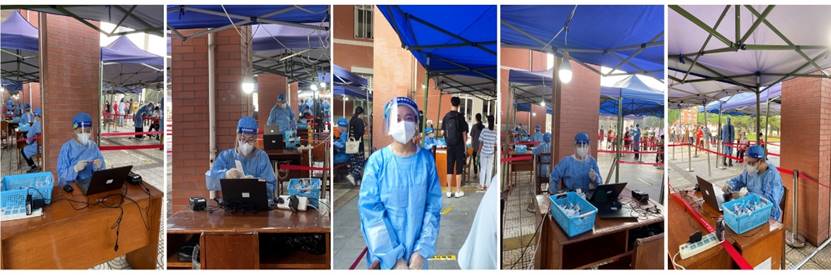 学院志愿者服务作用发挥不仅仅在校园里。在校外,也有他们奋战在抗疫情一线的身影。李颖老师参与了桂溪街道交子社区组织的志愿者抗疫服务工作,与众多社区志愿者一起负责核酸检测健康码录入,核酸队伍次序维护及相关服务工作。李珍焱老师在居住小区参与了门口查验进出凭证,测量体温,查验健康码和信息录入的工作。9月8日,林之恩老师所居住的小区出现确诊病例,小区被划为高风险区。他第一时间报名参加小区防疫志愿工作。