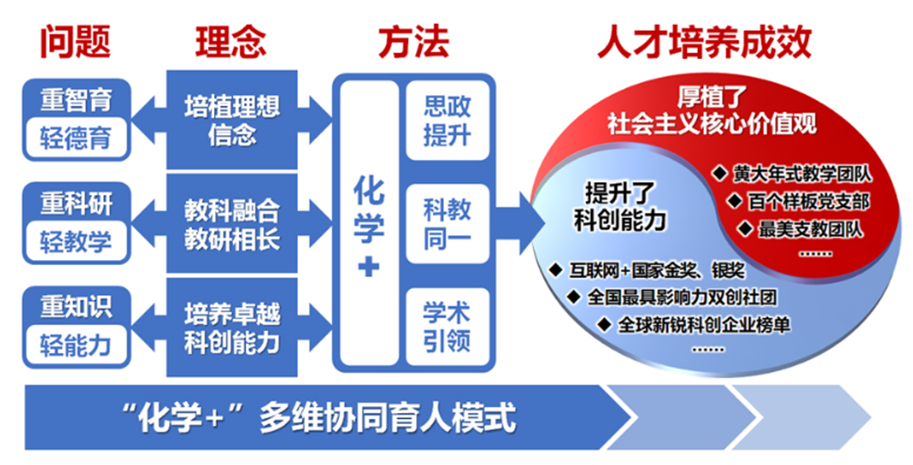该成果创建了“化学+”多维协同育人模式:通过“化学+思政提升”育人模式,采取在科研团队或学科方向建立师生混合党支部、国家级人才任支部书记等措施,厚植学生社会主义核心价值观;通过“化学+教科同一”模式,实施院士等高层次人才主讲本科课程等“五进课堂”措施,推进教学科研团队融合同一,克服“重科研轻教学”的不足;通过“化学+学术引领”育人范式,为学生配备高水平学业导师,开放科研资源,引导学生开展多层次科研训练,提升科创兴趣和能力。