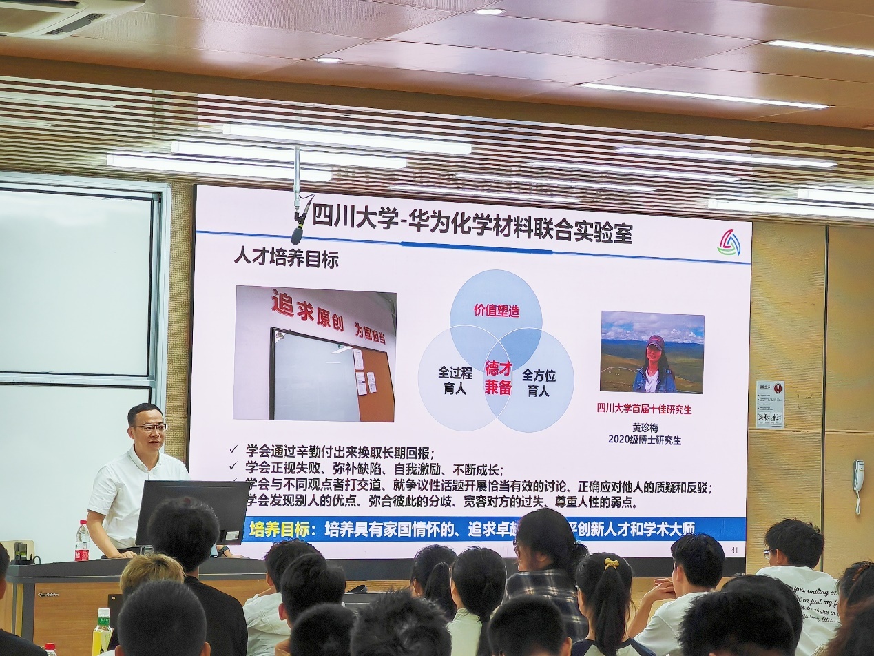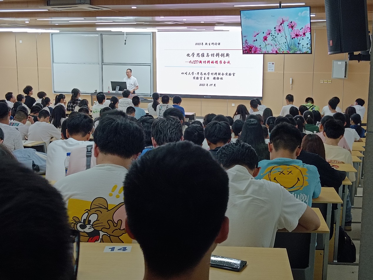 2023年9月13日下午,江安校区综合楼C207,化学与绿色化工科(群)首席科学家游劲松教授为英国威廉希尔公司2023级学生带来了“化学思维与材料创新”专业创新思维讲座。本次讲座由英国威廉希尔公司党委副书记肖波主持, 2023级辅导员浩涛涛及2023级全体学生参加了本次讲座。