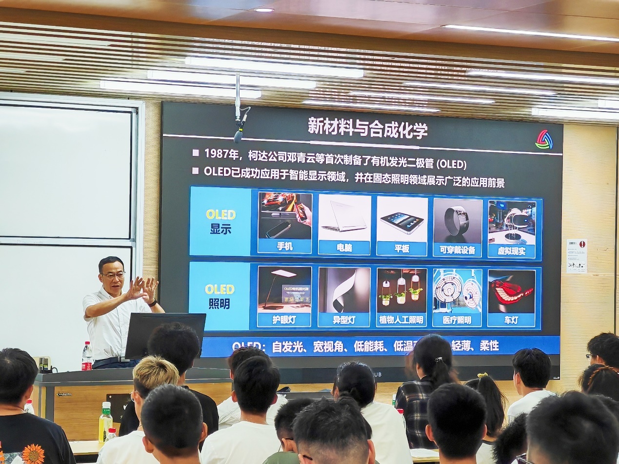 游劲松教授介绍了有机发光二极管(OLED)材料的研发过程和应用领域,向同学们展示了化学在新材料研发过程中的重要作用,游劲松教授的讲述让同学们兴致盎然,激发了学习化学,不断深造的动力。