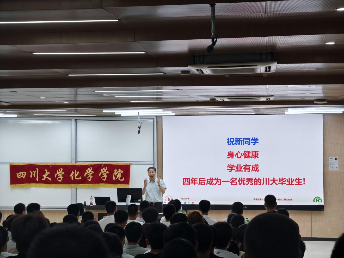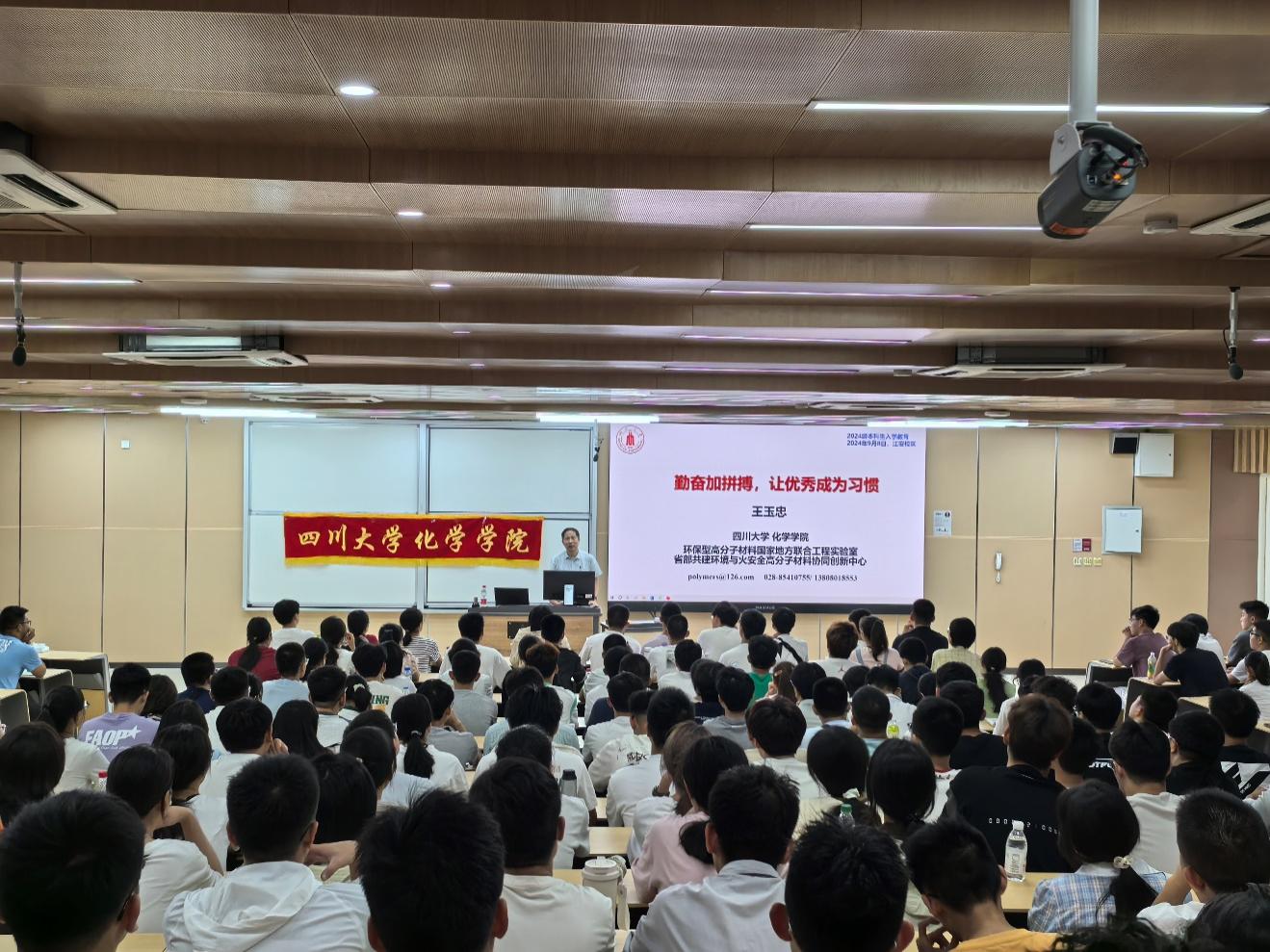 2024年9月8日,在江安校区综合楼C207,王玉忠院士为英国威廉希尔公司2024级本科生带来了新生入学教育讲座——勤奋加拼搏,让优秀成为习惯。学院党委副书记肖波、2024级本科生辅导员侯鹏飞及2024级全体本科生参加了此次讲座。