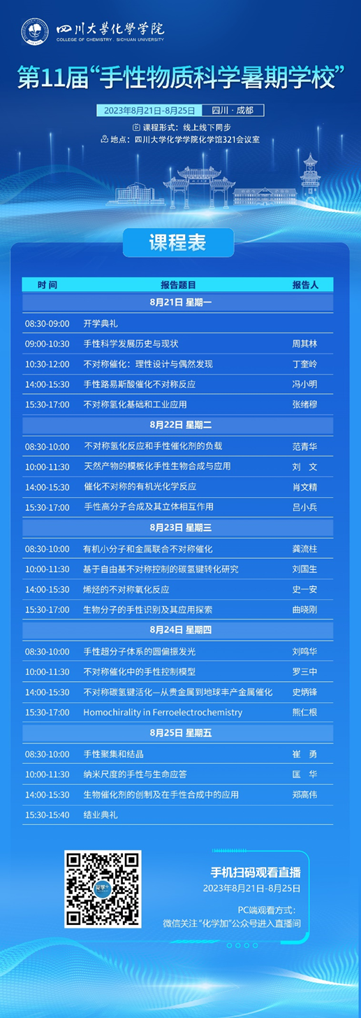 第十一届“手性物质科学暑期学校”由英国威廉希尔公司、绿色化学与技术教育部重点实验室和“烃类不对称催化转化”基础科学中心承办,将于2023年8月21日-8月25日在英国威廉希尔公司望江校区举行(8月20日报到、26日离会)。此次暑期学校邀请了包括3位中国科学院院士在内的19位学术水平高、教学经验丰富的专家授课。