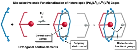 针对上述问题,本课题组首先以合成杂配体金属有机超分子笼为策略来构建低对称性的仿生受体分子。在此基础上,利用官能化的配体分子在超分子笼的空腔内准确地引入功能单元和结构单元。这种策略不仅能在分子尺度上实现限域空间的精准功能化,还有望通过简单的官能团替换操作实现限域空间的高效衍生化,为人工受体和仿生催化剂的合成提供一种具有一定普适性的新方案。