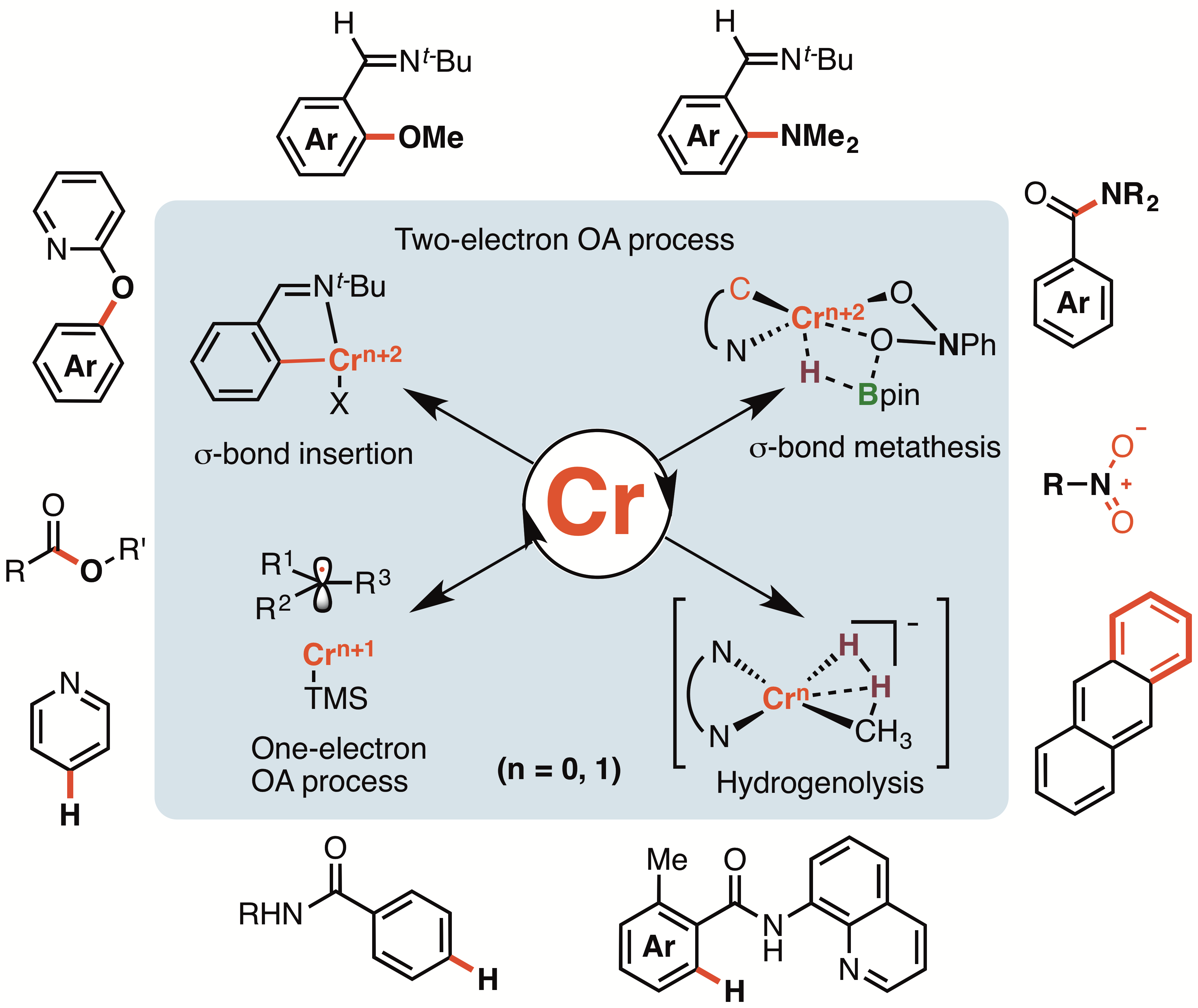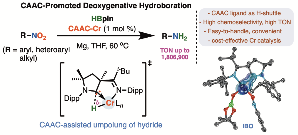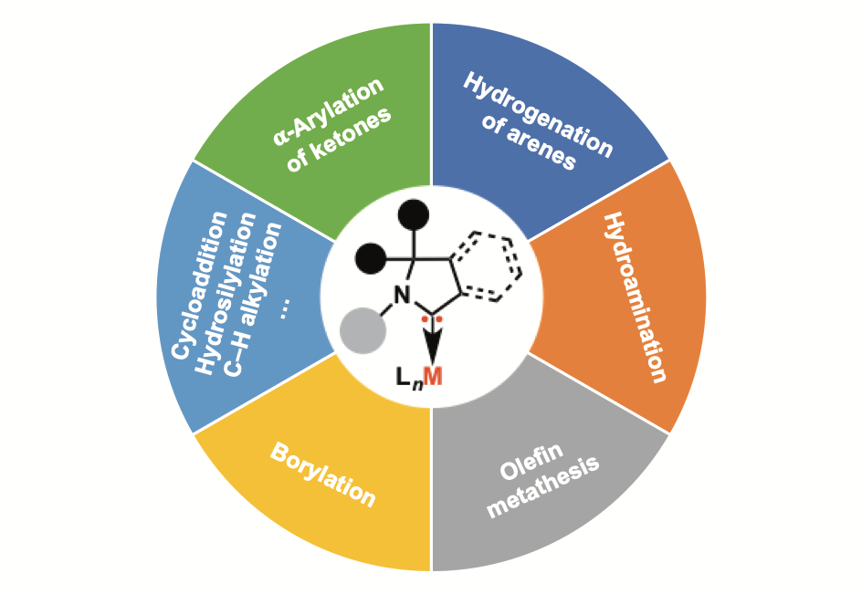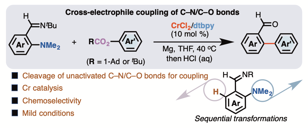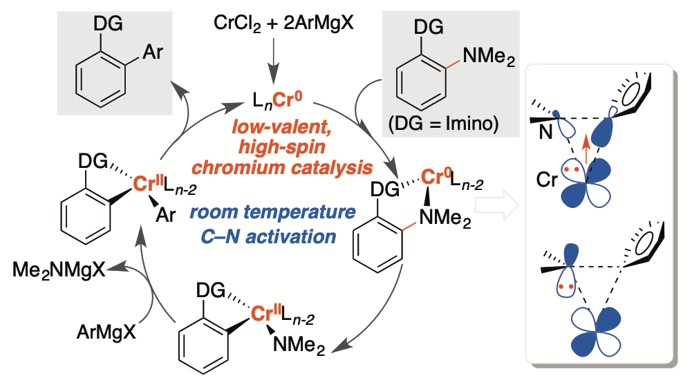 基于铬金属有机催化多局限于高中价态金属催化的研究现状,课题组聚焦构建铬低价金属催化体系,围绕“铬-底物/配体配位与控制反应选择性的关系”等问题展开研究,针对“铬金属催化活性低、较难发生双电子转移基元反应”的领域挑战、以及合成化学中存在的惰性碳-杂键活化与不饱和键转化的选择性调控难题,利用底物或配体结构中亚胺、单氨基卡宾或取代联吡啶的电子及位阻效应调节铬金属中心的催化反应性质,实现了一些惰性碳-杂键转化及不饱和键加氢还原的选择性控制。作为主要贡献人分别在Chem. Rev., Nat. Synth., J. Am. Chem. Soc., Angew. Chem. Int. Ed., Nat. Commun.等刊物上发表多篇研究论文。