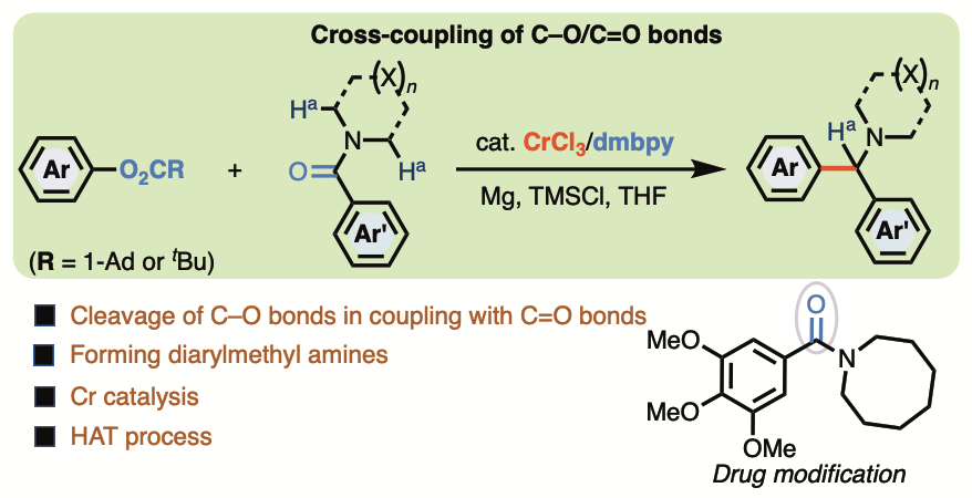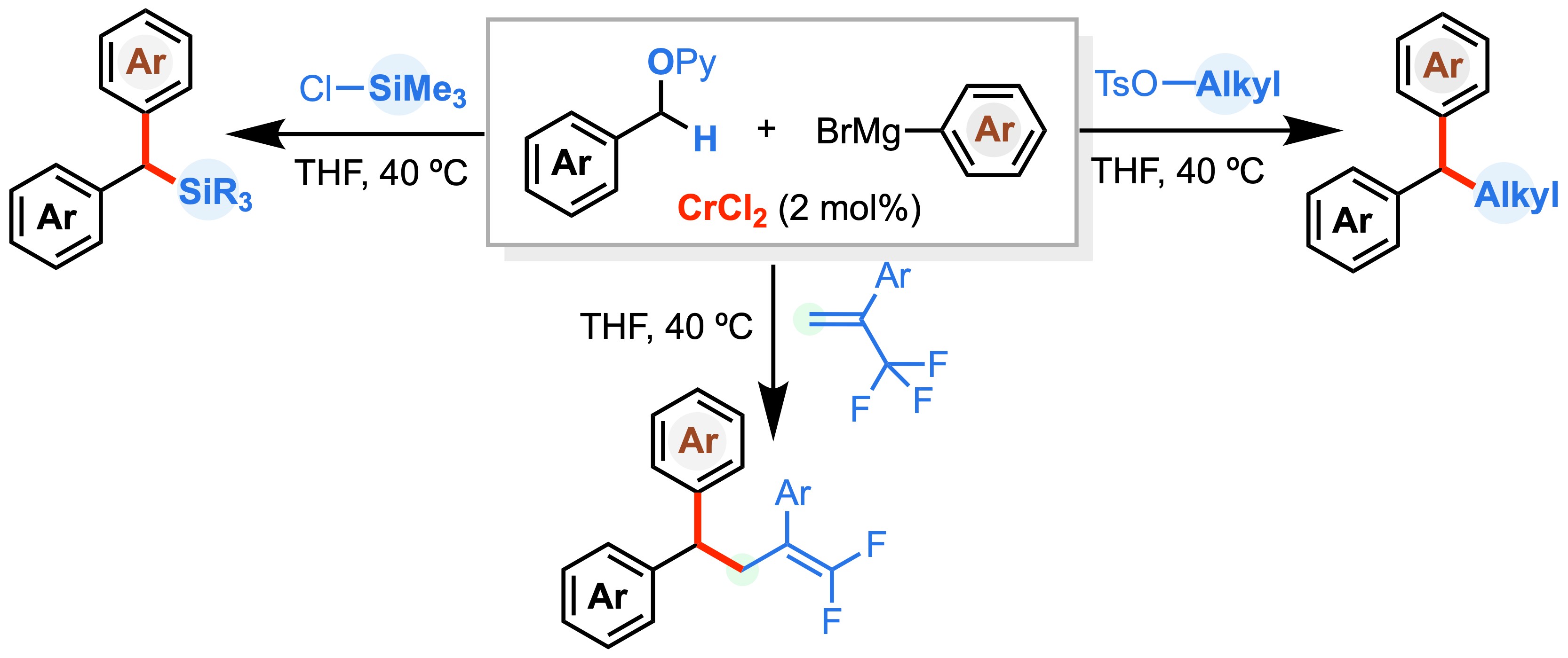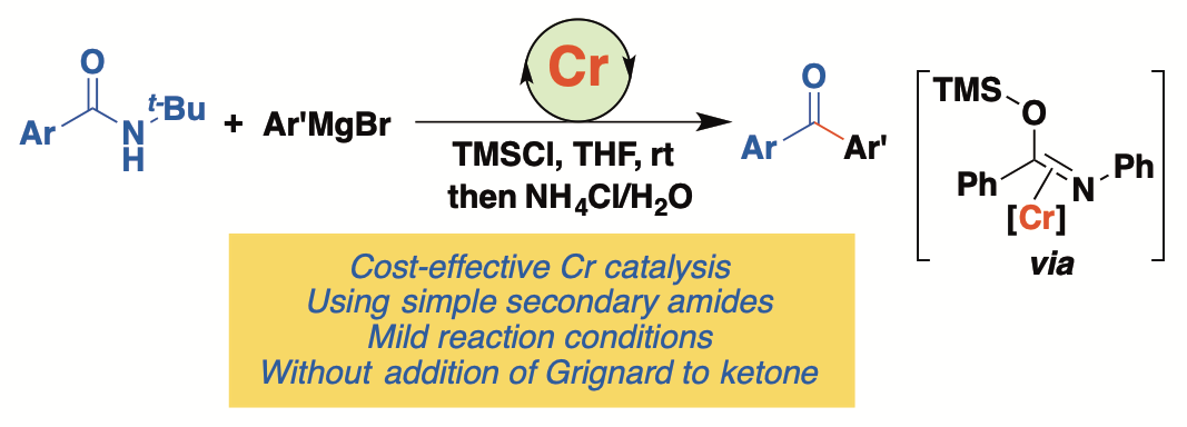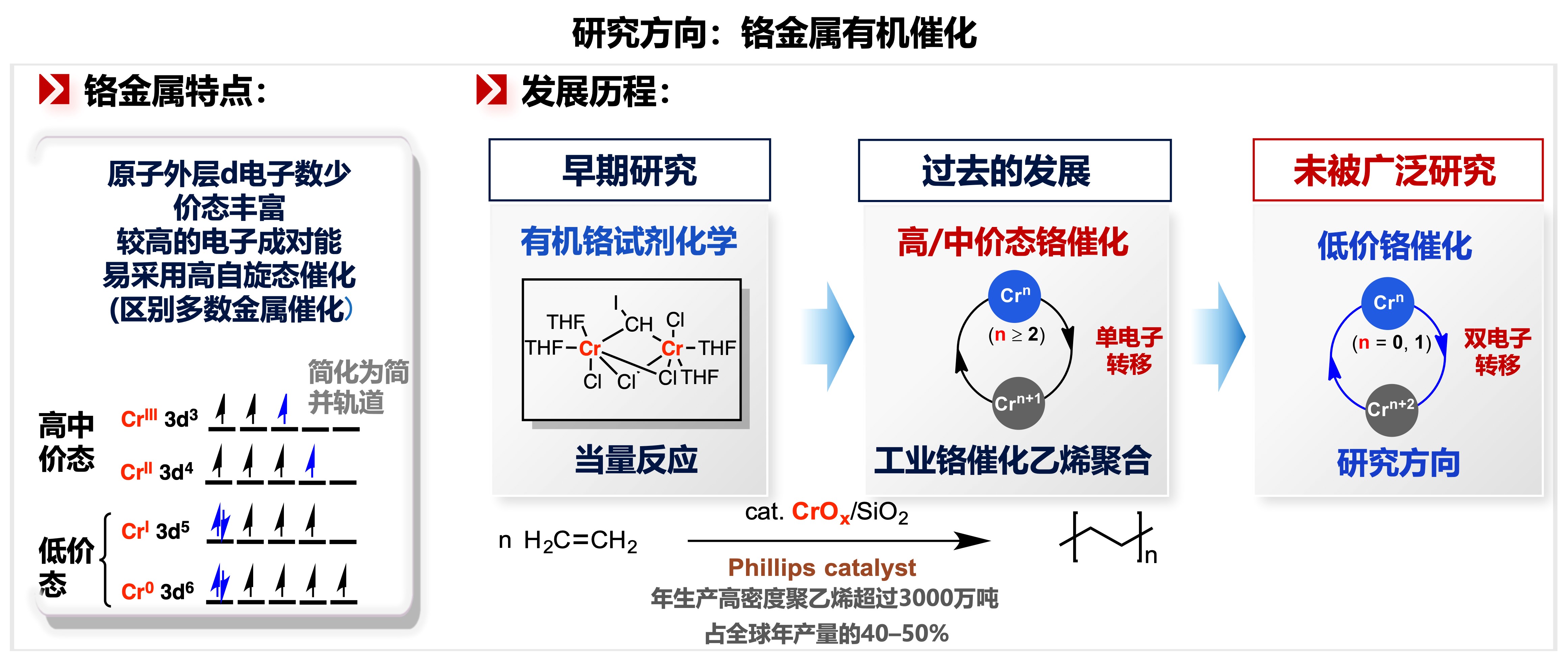 铬金属是重要的战略资源,是地壳中储量最为丰富的过渡金属元素之一。相较于第一过渡系其他金属如铜、镍、铁及钴的氯化物,氯化铬的毒性较低(Organometallics 2017, 36, 4071)。尽管铬金属有机催化已实现工业应用(如在工业上催化生产高密度聚乙烯),相较于其他金属催化,铬金属的催化性质与反应活性仍未被广泛研究与开发。课题组专注于探索丰产金属铬处于低价态时的催化性质,揭示铬低价金属有机催化的特点与规律,着力解决合成化学中存在的选择性挑战,发展铬低价金属催化的有机合成化学。