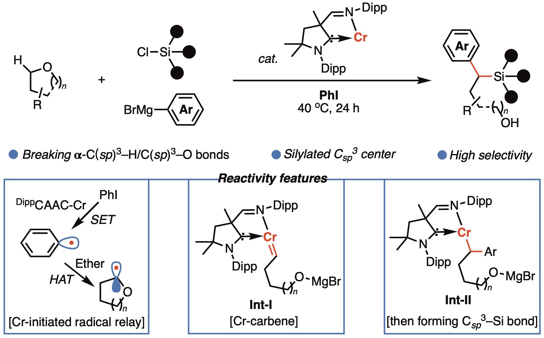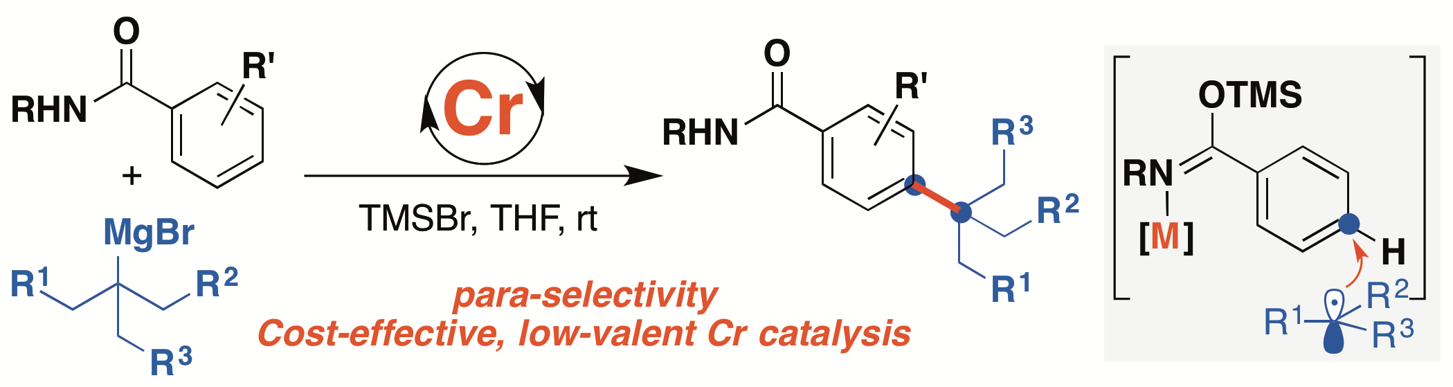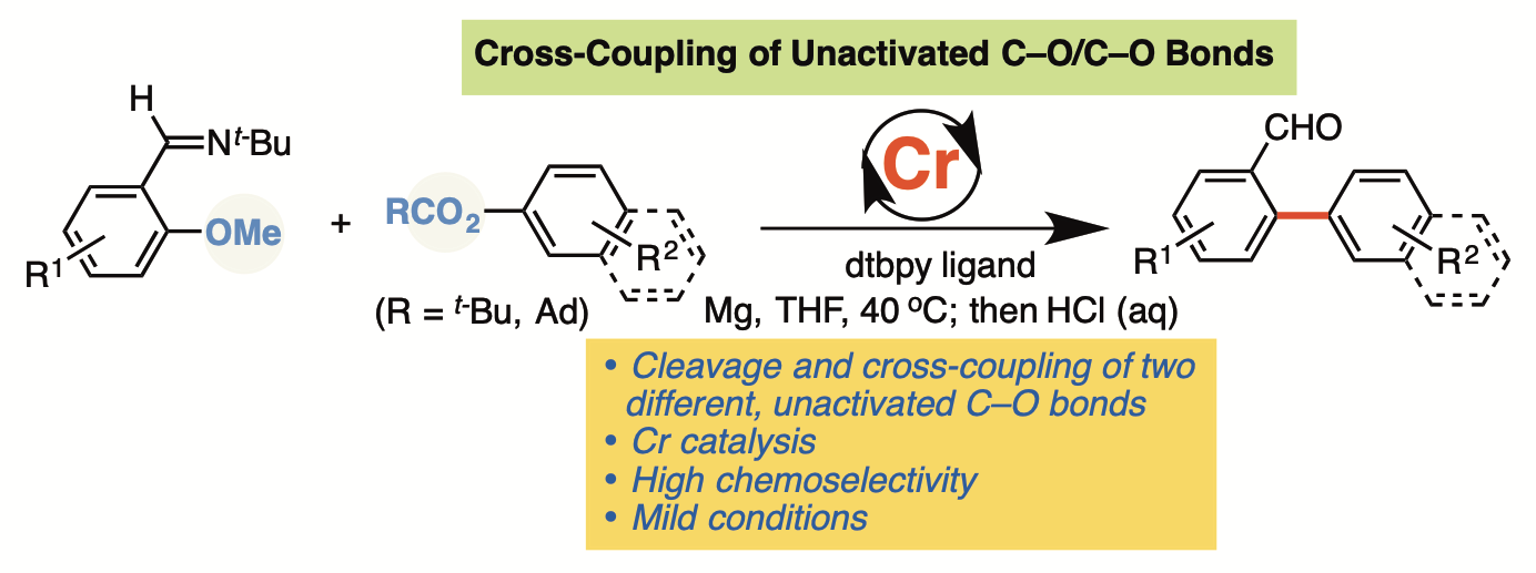 铬金属是重要的战略资源,是地壳中储量最为丰富的过渡金属元素之一。相较于第一过渡系其他金属如铜、镍、铁及钴的氯化物,氯化铬的毒性较低(Organometallics 2017, 36, 4071)。尽管铬金属有机催化已实现工业应用(如在工业上催化生产高密度聚乙烯),相较于其他金属催化,铬金属的催化性质与反应活性仍未被广泛研究与开发。课题组专注于探索丰产金属铬处于低价态时的催化性质,揭示铬低价金属有机催化的特点与规律,着力解决合成化学中存在的选择性挑战,发展铬低价金属催化的有机合成化学。