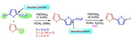 53. Fu, H.; Zhao, L.; Bruneau, C.; Doucet, H., Palladium-Catalysed Direct Heteroarylations of Heteroaromatics Using Esters as Blocking Groups at C2 of Bromofuran and Bromothiophene Derivatives: A One-Step Access to Biheteroaryls. Synlett 2012, (14), 2077-2082.