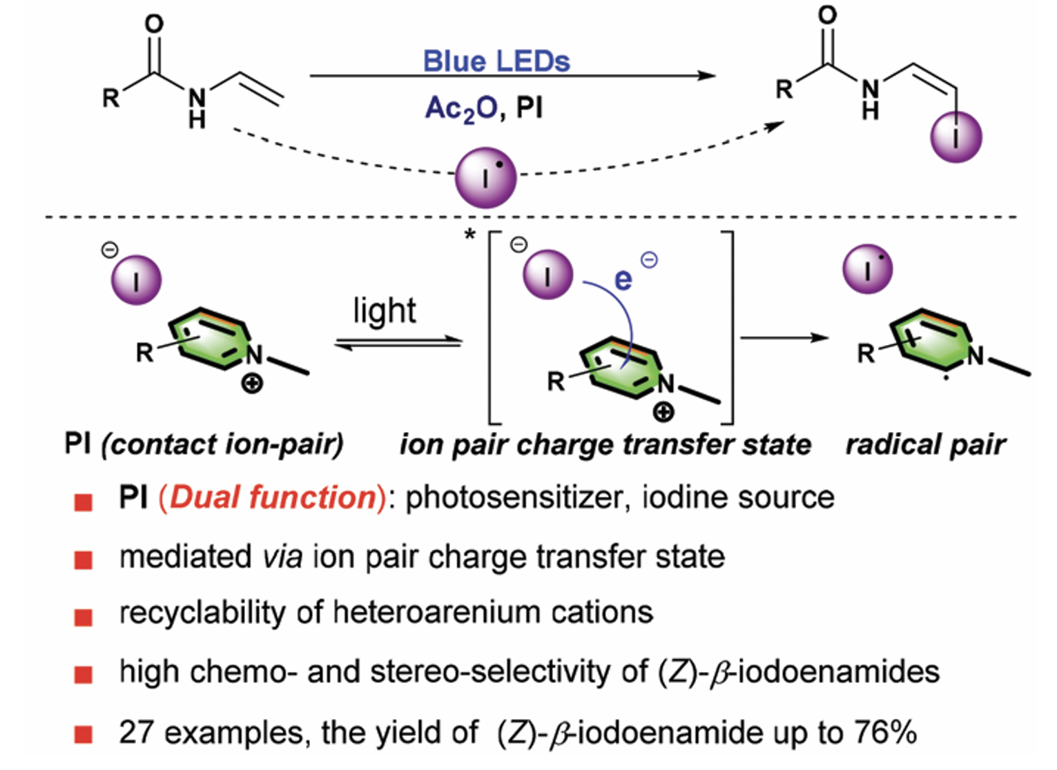 19. Sun, R.; Yang, X.; Ge, Y.-C.; Zheng, X.-L.; Yuan, M.-L.; Li, R.-X.; Fu, H.-Y.*; Chen, H., Visible light-induced synthesis of (Z)-β-iodoenamides from N-vinyl amides mediated by the ion pair charge transfer state. Org. Chem. Front. 2022, 9 (7), 1975-1981