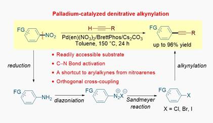 18. Palladium-catalyzed denitrative Sonogashira-type cross-coupling of nitrobenzenes with terminal alkynes.