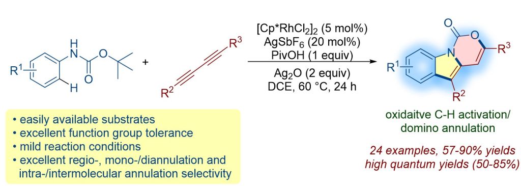 15. Rh(III)-Catalyzed Oxidative C−H Activation/Domino Annulation of Anilines with 1,3-Diynes: A Rapid Access to Blue-Emitting Tricyclic N,O-Heteroaromatics.