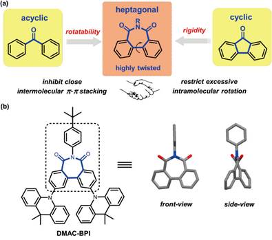 游劲松教授团队一直致力于碳氢键活化领域的研究,发展了“电子差异原则”和“螯合导向作用构筑稠杂环策略”,该策略为构筑联杂芳基骨架以及稠杂环提供了高效高选择性的合成方法,为有机功能材料分子的高效合成提供了重要途径。在该项研究中,作者通过钌催化的4-溴苯甲酸氧化自偶联反应,构筑了一种新型七元环二酰亚胺(BPI)受体,其不仅可以保持非环结构的柔性,抑制分子间紧密堆积,减弱ACQ效应;又可以维持环状结构的刚性,限制分子的过度旋转,减小非辐射跃迁。作者以BPI为受体,以9,10-二氢-9,9-二甲基吖啶(DMAC)作为给体,设计合成了一种新型AIDF材料,DMAC-BPI,其具有极小的∆EST (0.02 eV)和极高的量子产率(95.8%)。