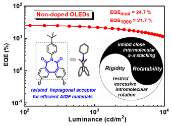 英国威廉希尔公司游劲松团队最近在非掺杂OLED器件中取得了突破性进展,发展了一种基于扭曲七元环二酰亚胺受体的聚集诱导延迟荧光材料(AIDF),实现了最优性能的非掺杂OLED器件。