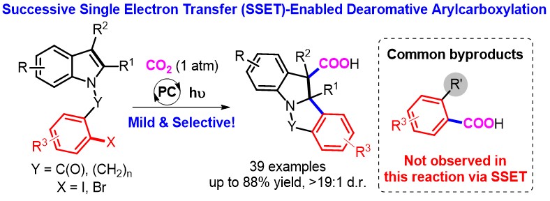 我院余达刚教授课题组一直致力于绿色有机合成化学研究,主要集中于二氧化碳(CO2)资源化利用和可见光催化,发展了可见光促进的CO2高效转化新策略和新方法(ACIE 2017, 56, 15416; OL 2017, 20, 190; ACIE 2018, 57, 13897; JACS 2018, 140, 17338; OL 2018, 20, 3049; Nat. Commun. 2019, 10, 3592)。针对CO2参与多组分还原偶联反应中存在的挑战,不同于以往过渡金属催化的双电子氧化加成过程,余达刚教授团队利用“连续单电子转移(successive single-electron transfer, SSET)”策略,基于“自由基-碳负离子”反应历程,成功实现了第一例可见光促进CO2参与的吲哚类化合物的还原去芳构化-羧基化反应。在该工作中,余达刚教授团队在无过渡金属、较低的光催化剂用量以及一个大气压CO2 的温和条件下高选择性地实现了吲哚类化合物的还原去芳构化反应,为合成重要的吲哚-3-羧酸类化合物提供了新方法。机理研究证明苄基自由基及苄基负离子可能是反应的关键中间体。