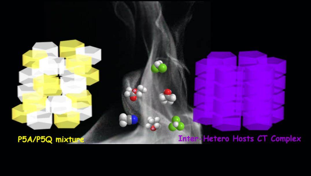 最近,我院杨成课题组在异质主体CT复合物的形成和形态控制方向取得重要进展。发现具有富电子空腔的全甲基化柱[5]芳烃(P5A)与缺电子空腔的全氧化产物柱[5]醌(P5Q)之间能够形成异质主体CT晶体。通过扫描电子显微镜(SEM)、粉末X射线衍射(PXRD)、氢谱、热重和X射线单晶衍射等多种手段证实,该微晶的形成除了源于CT相互作用外,大环主体分子对溶剂的包结作用起到了至关重要的作用,溶剂分子作为桥梁在控制晶体成核和生长过程、决定所得材料的形态特性等方面起到重要的“胶水”作用。研究表明,实验室不同有机溶剂的蒸汽对能否诱导P5A/P5Q固体粉末形成CT微晶、着色程度、着色时间以及所形成的CT峰的紫外吸收强度(ICT)与吸收波长均存在显著差异,从而发展了一种区分实验室不同有机溶剂的快速、简便及可视化方法,解决了实验室常用的有机溶剂因其无色、具有挥发性且化学惰性,不借助分析仪器难以直接区分的难题。
