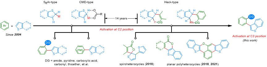 含(苯并)噻吩的联杂芳烃骨架是有机光电材料中广泛存在的结构片段。过渡金属催化的杂芳烃之间的氧化C−H/C−H偶联反应无疑是构筑该类骨架最为简洁高效的策略之一。然而,由于(苯并)噻吩自身C2和C3位的电性差异,无论经历芳基亲电取代(SEAr)或协同脱氢金属化(CMD)的机制,(苯并)噻吩的C−H/C−H型芳基化反应均发生在C2位,因此实现(苯并)噻吩选择性的C3位C−H/C−H芳基化反应面临巨大挑战。