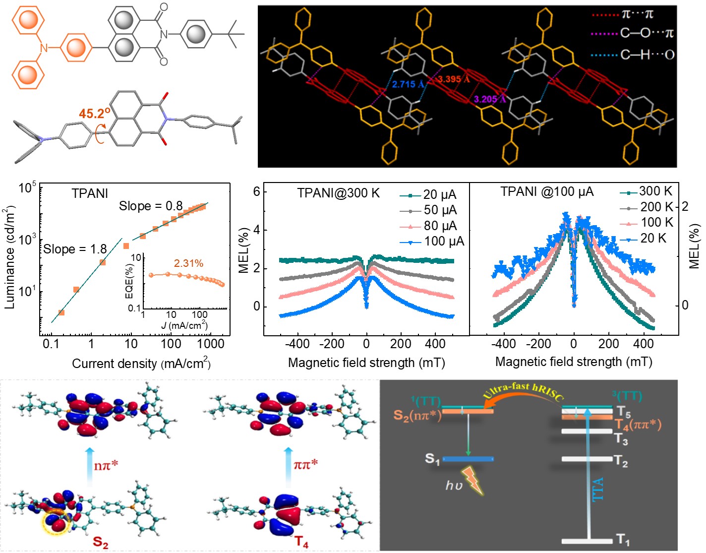 近日,卢志云教授团队在Nature Communications上发表了相关研究工作进展,指出如能赋予分子以三线态通道的三线态-三线态湮灭(TTA)能力(即:T1 + T1 → Tn + S0),则OLED中经电注入所产生的3ππ*型T1“冷”激子便可高效转化为高能量的3ππ*型Tn激子(能量甚至可超过4.0 eV);如若化合物同时还拥有与Tn接近的1nπ*能级,则可借助3ππ*→1nπ*的超快hRISC过程(SOCME: 接近10 cm-1;khRISC: >109 s-1),将Tn激子有效转化为单线态激子,从而对OLED中的T1“冷”激子实现有效利用。他们以TPANI为实验示例验证了上述结论,发现在基于TPANI的OLED中,通过nπ*助力的TTA介导的hRISC过程的激子利用率可超过10%。这一研究工作有望能加深人们对三线态通道TTA过程的认知、唤醒人们对nπ*型激发态的关注,为开发高性能hRISC-OLED材料提供了新思路。