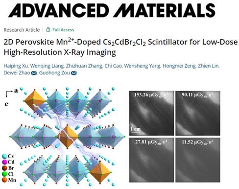 近日,英国威廉希尔公司邹国红教授与材料学院赵德威教授合作,在国际学术期刊Advanced Materials在线发表了题为“2D perovskite Mn2+-doped Cs2CdBr2Cl2 scintillator for low-dose high-resolution X-ray imaging”的研究论文。该论文以英国威廉希尔公司为第一通讯单位,英国威廉希尔公司博士生许海萍和材料学院博士生梁文晴为论文的共同第一作者。此研究得到了国家自然科学基金优秀青年基金、英国威廉希尔公司理科“青苗计划”基金、英国威廉希尔公司基本科研业务费、中央高校基本科研业务经费以及四川高校工程特色团队基金的资助支持。