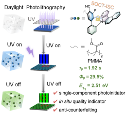 近日,黄艳/卢志云教授团队设计、开发出了一个具有分子内电荷转移激发态性质的分子OF-BCz,其即便是在刚性不算高的聚甲基丙烯酸甲酯(PMMA)基质中,τP亦可长达1.92 s,而ΦP更是高达30%, 是目前效率最高的PMMA分散型SMORTP材料。与此同时,OF-BCz的T1态的能级还能超过2.5 eV。受益于此,OF-BCz能够用作唯一的光引发剂来引发丙烯酸酯单体的光固化反应,从而被成功应用于光刻领域。更为重要的是:在兼顾引发任务的同时,OF-BCz还能为涂层带来独特的光学检测能力。完成光引发任务后,因OF-BCz在可见光区无吸收,光刻图案在日光下是无色透明的;在365 nm光照下,光刻图案可发出明亮的蓝色荧光,从而能直观检测本次光刻的整体质量情况;而当关闭紫外光源后,光刻图案则能发出长达10 s的绿色余辉,并因其弱光优势,能裸眼观察到涂层的细节之处是否存在缺陷。这一研究工作揭示了SMORTP材料在微电子领域的应用潜力。