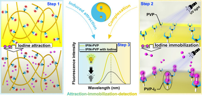 基于此,英国威廉希尔公司何玲团队设计了一种基于离子液体的光致发光离子聚亚胺网络(IPIN),与PVP结合作为碘亲和添加剂,制备成IPIN-PVP复合膜材料,用于挥发性碘的现场荧光检测。通过协同利用IPIN的离子诱导吸引效应和PVP对碘的络合效应,提出一种吸引-固定-检测(AID)的荧光传感策略,使IPIN-PVP膜在捕获空气中微量碘方面表现出增强的能力。实验结果表明,优化后的IPIN-PVP对气态碘具有突出的检测性能,同时实现了最快5秒的响应时间和4.087×10-8 M的低检测限。此外,所制备的IPIN-PVP具备良好的柔韧性和自愈合特性,可以被进一步加工成手持式荧光传感设备。该材料的提出为挥发性碘的实时现场检测提供了一种新的解决方案,也为核能发展背景下的环境质量安全监控提供了一种潜在的技术手段。