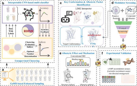 近日蒲雪梅教授团队从变构机制的残基构象变化的本质出发,结合机器学习和MD创新性地开发了一个能够从高维复杂的MD构象空间中挖掘关键构象并识别出变构位点的杂化机器学习方法(RHML),成功识别出β2AR受体的一个全新变构位点及负变构调剂,并通过阐明其调节机制进一步给出了其变构作用的理论依据。基于这些充足的计算证据,邵振华教授团队完成了cAMP累积实验以及定点突变实验,实验结果和计算完全一致,确认了变构位点和所筛选配体的负变构效应。该研究工作所开发的识别方法为众多的靶标蛋白家族变构位点和药物识别提供了一个新的智能分析工具,有助于推进变构药物的开发。此外,研究结果为β2AR变构药物的研发提供了一个全新的变构位点,所识别出的ZINC5042是首个报道的 β2AR的G蛋白偏向的负变构调节剂,可为治疗充血性心力衰竭(CHF)所需的 β-blocker的研发提供了一个潜力的候选物。