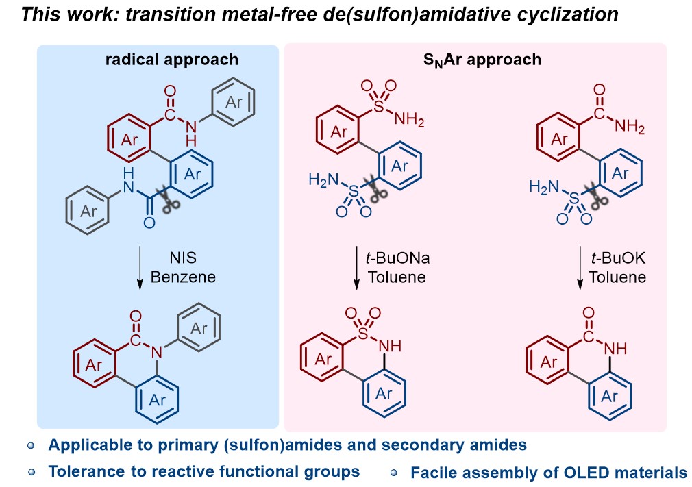 相较于其它羰基类化合物,如羧酸和羧酸酯等,酰胺类化合物由于酰胺键的共振稳定性而活化困难。以往的活化方法主要依赖于过渡金属催化的脱羰官能化反应。该方法通常需要使用具有强给电子能力和空间位阻的配体,以及活性较高的叔酰胺底物。近日,英国威廉希尔公司的游劲松教授和杨宇东教授团队发展了一种自由基型联芳基二酰胺脱酰胺基环化反应,为直接脱酰胺基官能化方法及二苯并内酰胺衍生物的构筑提供了一种新的途径。沿着这一思路,该团队又开发了基于芳环亲核取代反应机制的联芳基二磺酰胺及同时含有酰胺和磺酰胺基团的联芳基化合物的脱磺酰胺环化反应,实现了一系列二苯并内磺酰胺衍生物和二苯并内酰胺衍生物的构筑。这些方法无需过渡金属的参与,对包含卤素在内的多类反应性官能团具有良好的兼容性。作者将获得的二苯并内酰胺和二苯并内磺酰胺骨架作为受体单元,分别构筑了热活化延迟荧光(TADF)分子DMAC-PDO和DMAC-BTZ。其中,以DMAC-PDO作为发光分子的OLED器件的最大外量子效率(EQEmax)为23.1%。该方法为温和条件下的惰性化学键活化提供了新的途径。