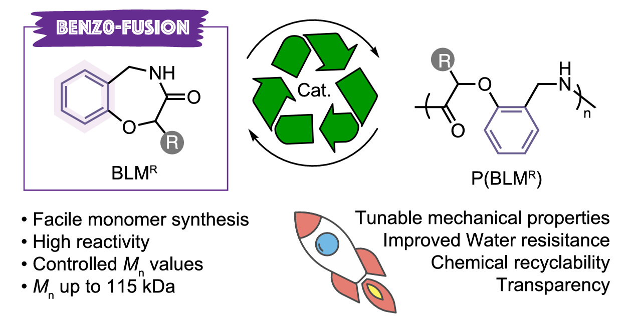 针对上述问题,朱剑波课题组设计了一类新型苯并内酰胺单体(BLMR),该单体可通过可控开环聚合反应制备高分子量半芳香性聚酰胺P(BLMR),其分子量高达115 kDa(图1)。与传统PA6相比,P(BLMR)展现出优异的材料性能:1)优异的热稳定性,热失重温度Td,5%高达368 ℃,玻璃化转变温度Tg高达134 ℃;2)突出的耐水性,一周吸水率低至0.55%;3)可调控的机械性能,断裂伸长率最高可达384±20%;4)优异的光学透明性,透光率达91%。值得注意的是,在100-150 ℃的稀溶液体系中,采用t-BuOK与La[N(SiMe3)2]3组成的混合催化剂,可实现P(BLMR)的高效化学回收,回收单体可以再次聚合生成P(BLMR),从而建立材料闭环循环体系。