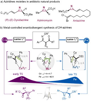 围绕上述关键科学问题,我院刘小华教授和冯小明教授团队取得重要进展,利用手性双氮氧配体(冯氏配体)和廉价金属(铁和钴)为催化剂,成功开发出首例金属调控的分子内串联重排对映发散性合成策略,高效构建了一系列2H-azirines及其衍生物。通过简单的改变金属从钴到铁,无论在光照还是加热条件下,都能够表现出优异的手性翻转催化功能。其中钴催化的反应即使在万分之五的极低催化剂负载下也具有很高的催化效率。结合机理实验和密度泛函理论计算,揭示了钴和铁独特的电子性质调节了关键中间体的构像和二面角,从而实现了手性翻转。该研究展现了手性双氮氧/金属配合物在发散性合成中的巨大潜力,也为高张力氮杂环化合物的精准构筑开辟了新路径。