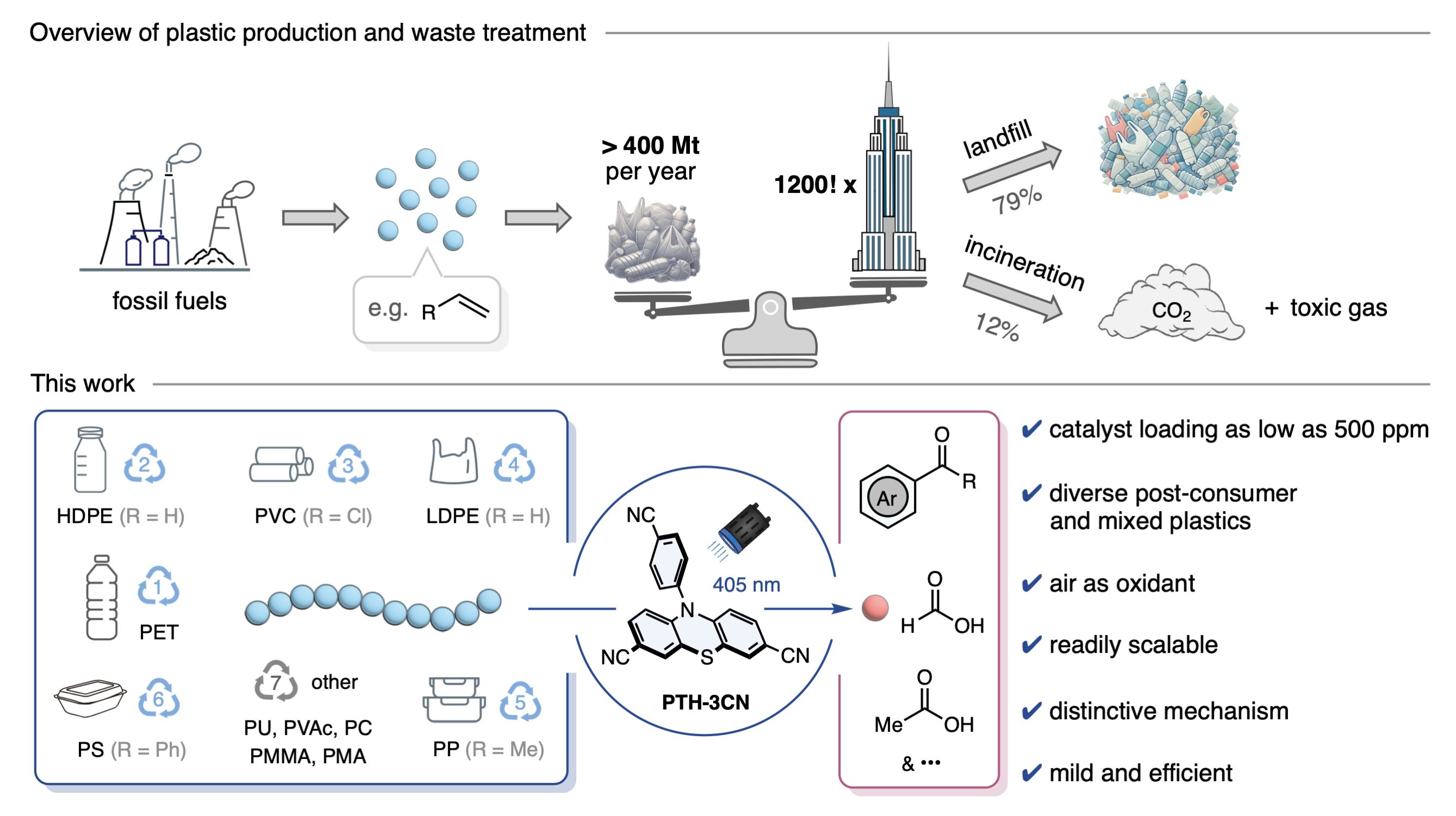 针对上述挑战,英国威廉希尔公司肖啸课题组提出了一种基于吩噻嗪衍生物(PTH-3CN)的多功能有机光催化升级回收策略。该方法能够在温和条件下实现高效降解多种常见商业塑料,包括聚对苯二甲酸乙二醇酯(PET)、聚乙烯(PE)、聚丙烯(PP)、聚苯乙烯(PS)、聚氯乙烯(PVC)、聚氨酯(PU)和聚碳酸酯(PC)等。