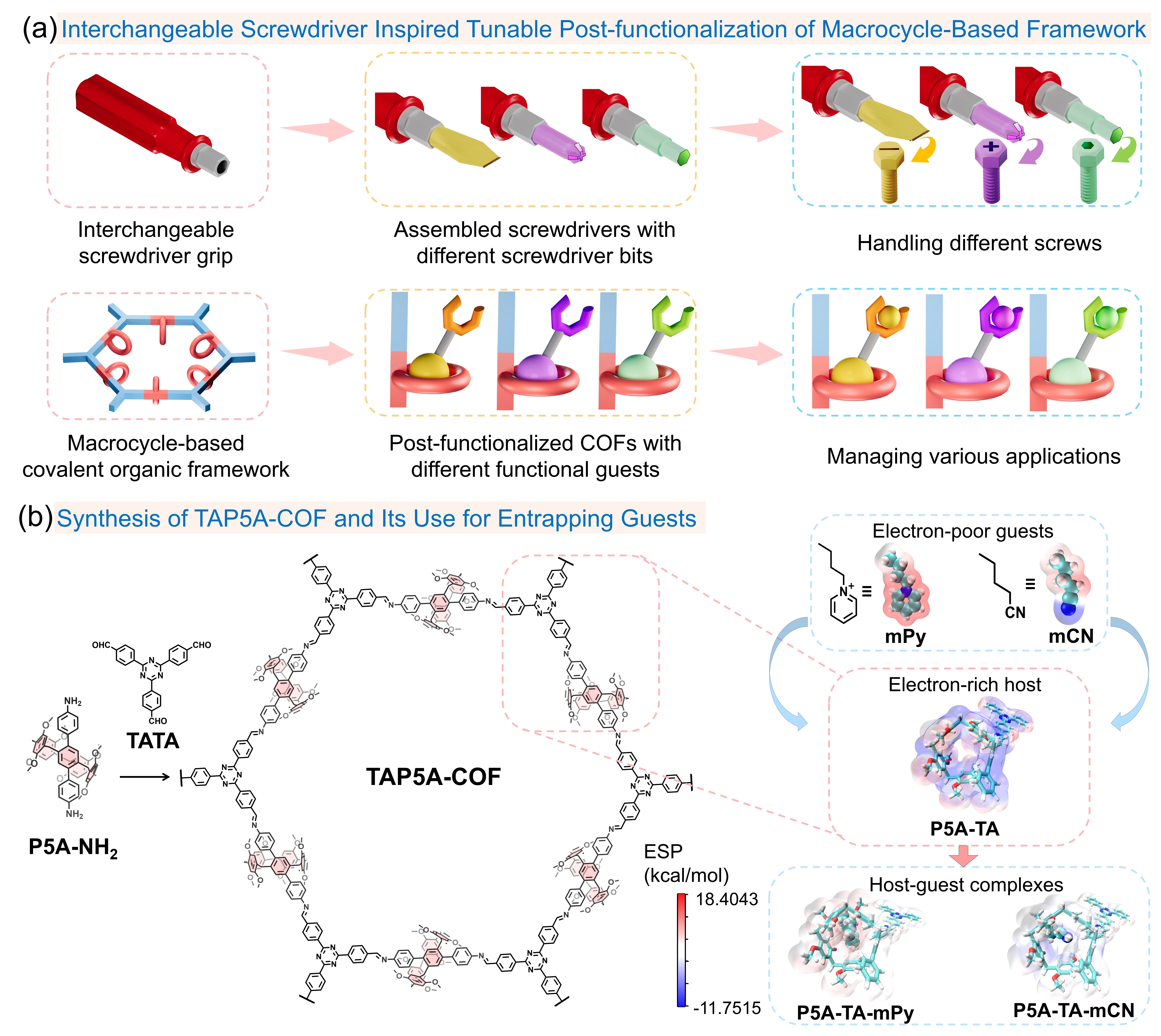 图1. (a)大环超分子策略用于非共价可切换COFs合成后功能化示意图;(b)大环芳烃COF平台的设计合成与对阳离子客体的主客体作用