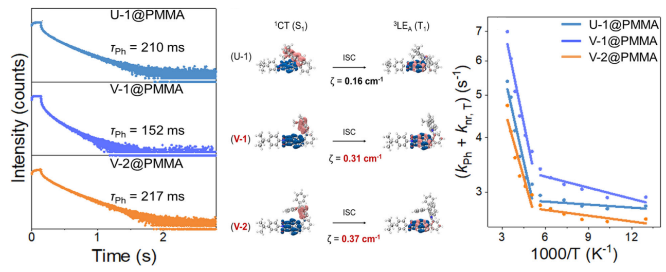 光物理实验结合量子力学计算结果表明,V-型分子相较U-型分子能具有更高的磷光效率,其主要原因在于其具有更大的D/A单元二面角(使得其系间窜越过程具有更大的旋轨耦合矩阵元)的同时,还能兼具较强的辐射跃迁禁阻性质。此外,通过引入合适的基团可赋予磷光团分子更大的结构刚性,抑制三重态激子的非辐射跃迁,进而延长材料的磷光寿命,提升磷光效率。