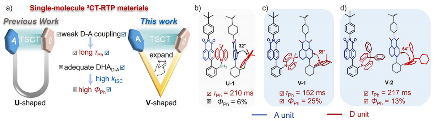 近日,卢志云教授团队在上述基础上,又提出了一个能兼具长寿命和高效率的3CT-ORTP材料的理性策略——去除U-型分子中的sp3-C桥连原子,构建具有V-型分子几何结构的D-A分子。(图1)。所获得的两个新型目标化合物V-1和V-2,不但磷光寿命均可超过0.1 s(0.15~0.22 s),磷光效率也均可超过10%(13%~25%)。