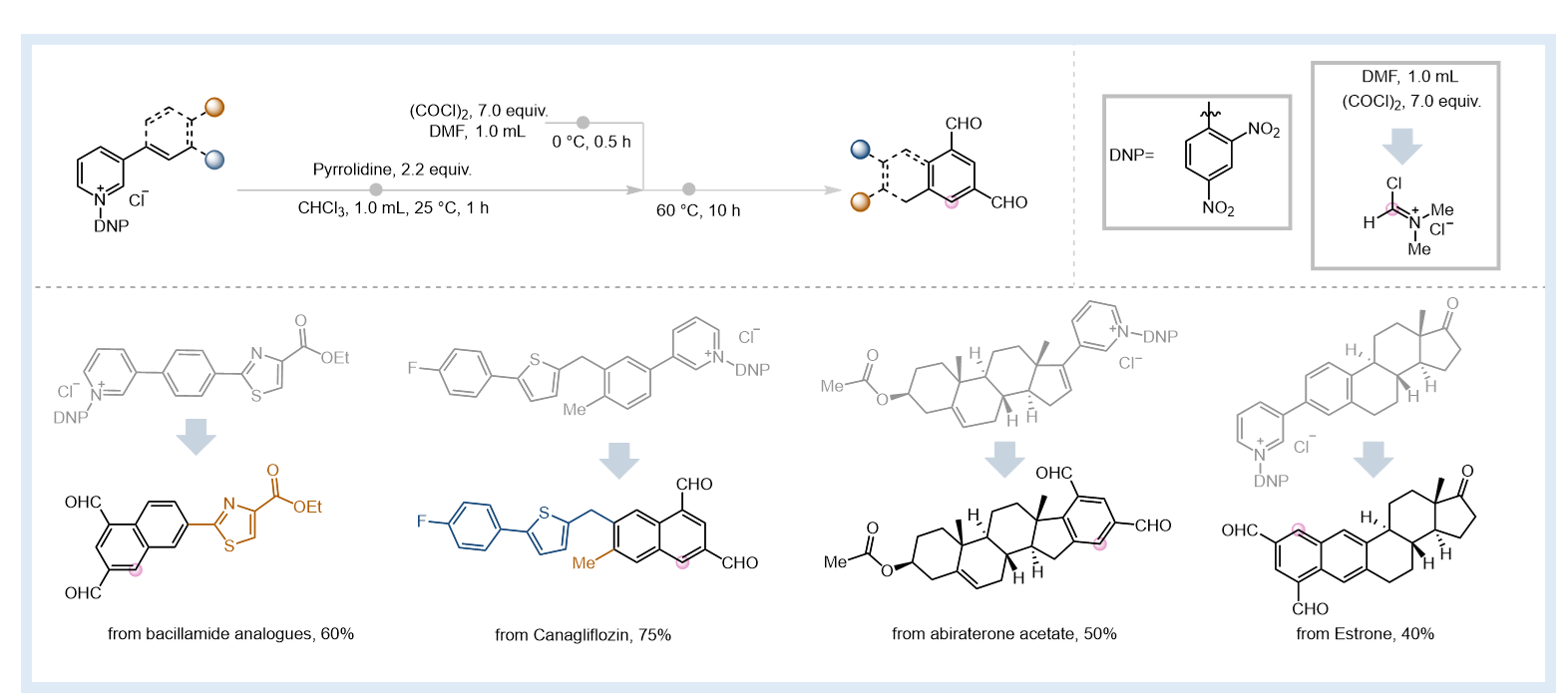 英国威廉希尔公司付海燕/陈华团队发展了一种创新的吡啶骨架编辑方法,本研究团队通过精心设计反应路径,利用Vilsmeier试剂作为双亲电试剂,在精确调控的反应条件下,成功实现对吡啶开环中间体的亲电修饰,从而高效地将吡啶类化合物转化为1,3-双醛基芳香化合物。该方法具有优异的底物普适性,最高产率可达90%,并能应用于糖尿病药物卡格列净、前列腺癌药物阿比特龙等生物活性分子的后期修饰。所得双醛产物可作为关键合成砌块,进一步衍生为多种功能分子。该研究在实现分子骨架精准编辑方面取得了重要突破,为药物研发和功能分子构建提供了一种全新的工具和思路。
