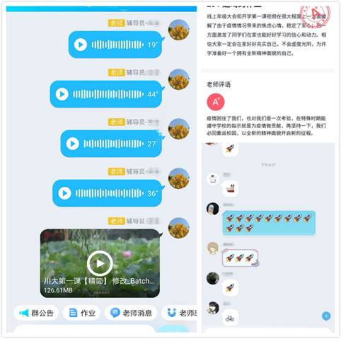 辅导员老师用亲切的话语表达了对同学们的关心,鼓励同学们在这个特殊时期,要坚定信念、沉着理性、同舟共济、守望相助,坚定抗疫战争一定会胜利的决心;同时也对同学们提出了尽快适应线上教学转变的要求,希望同学们要培养和训练自己主动使用网络资源、提升学习自觉性和学习能力,要尊重老师的劳动成果和知识产权。