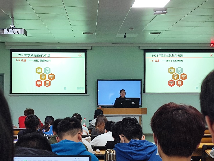 杨老师通过精心准备的短视频、详细的数据图表分析以及生动真诚的语言,为同学们讲解了2022年就业的挑战和机遇、分析了2021届高校毕业生就业情况、讲解了当前的就业政策以及就业前需要做的准备。