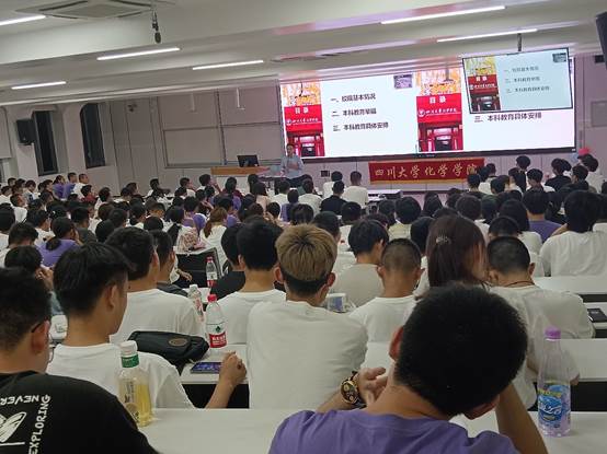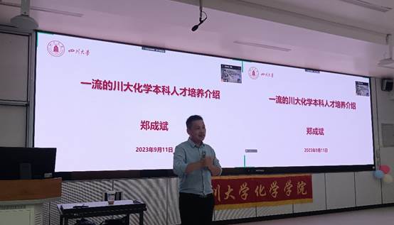 2023年9月11日,江安校区综合楼C107,英国威廉希尔公司副院长郑成斌教授为2023级本科新生开展主题为“一流的川大化学本科人才培养介绍”的入学教育讲座。本次讲座由党委副书记肖波主持,2023级辅导员及学院2023级全体本科新生参加。