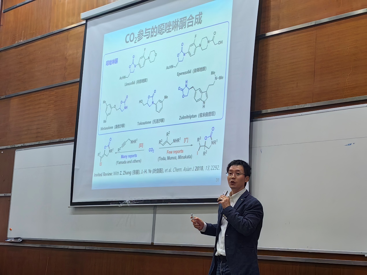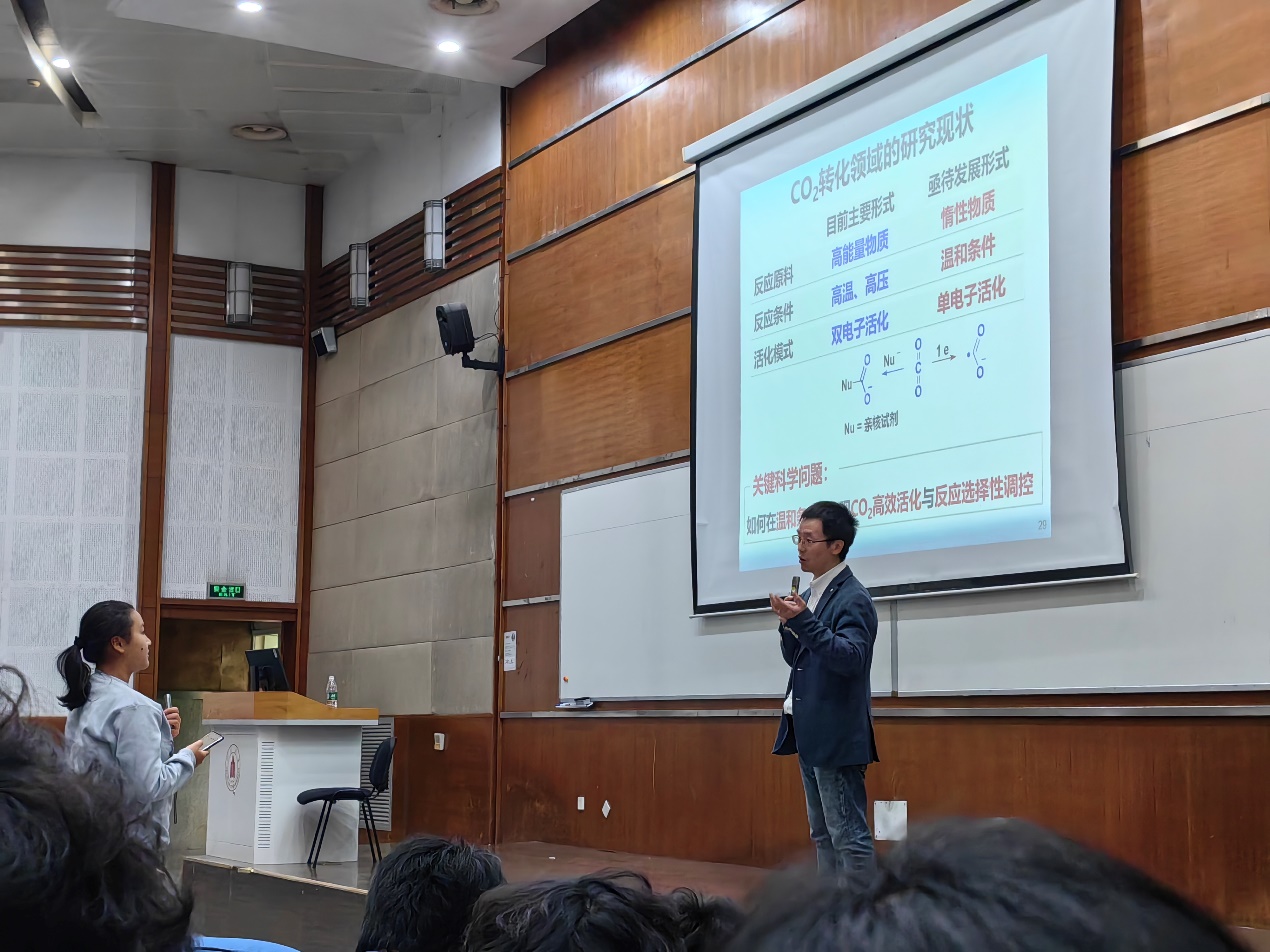 随后,余达刚教授以当今世界所面临的危机与青年需要承担的责任开始,引出合成化学的重要性,并分享了自己对此的心得体会。余达刚教授结合自己的研究讲述了二氧化碳活化和利用的多种策略,让同学们深入了解了二氧化碳转化领域的研究现状,介绍了现有的多种有关二氧化碳活化的前沿研究,并提出创新性思维在其中的重要作用及创新成果。