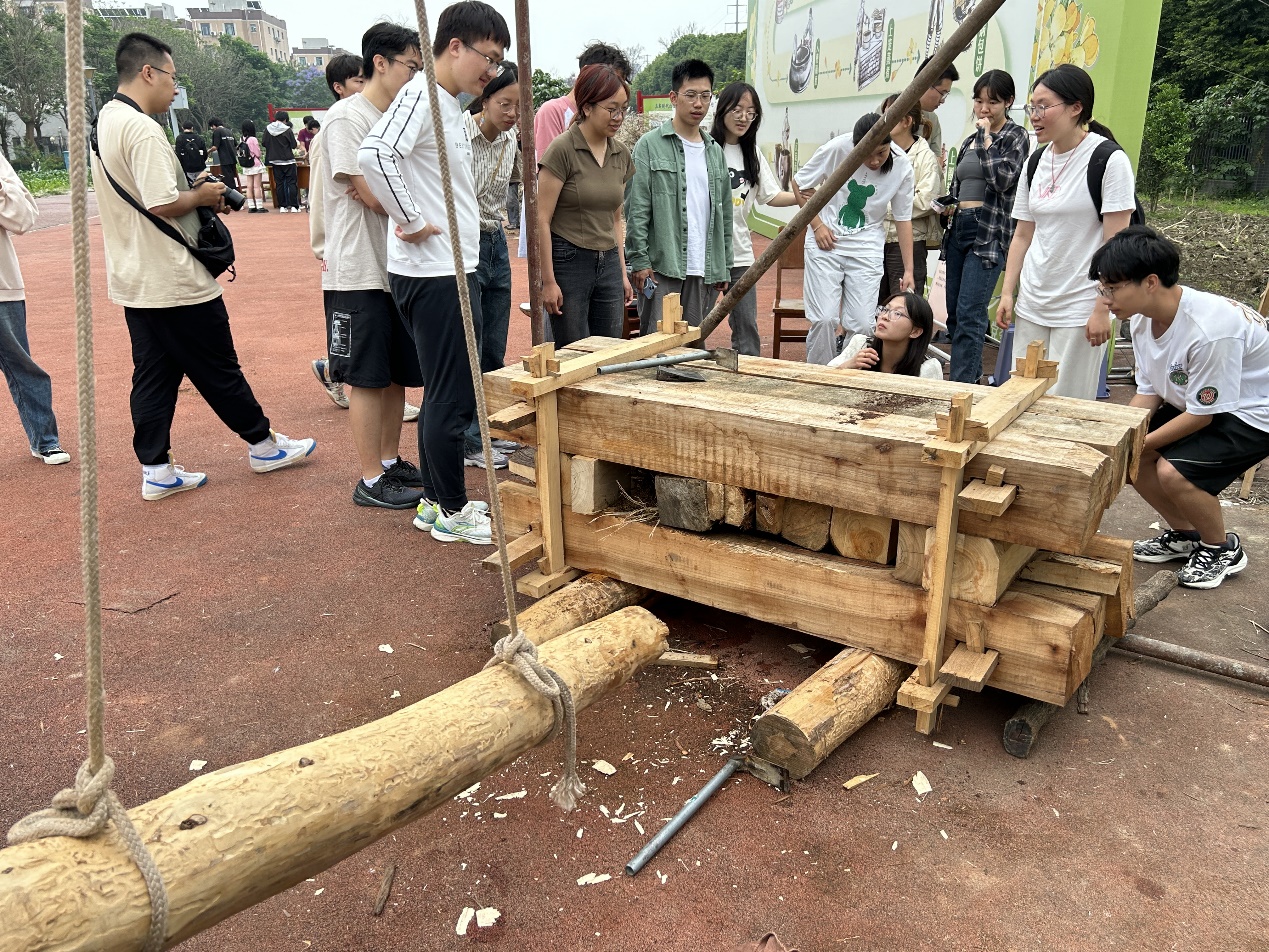 随后,同学们体验了用长达三米的撞锤有节奏地撞击槽中的木桩来压榨出油的有趣的榨油过程。
