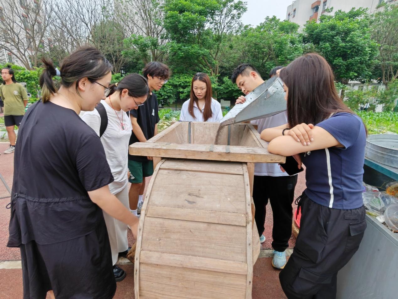 同学们在开心农场的老师的带领下,先为开心农场中正在生长的玉米苗除草,帮助其更好的生长,再亲身体验了从茶籽到成品植物油的“古法榨油”的全部流程,其中包括炒籽、石磨碾籽、热蒸、包饼、木桩冲压和过滤的六项工序。