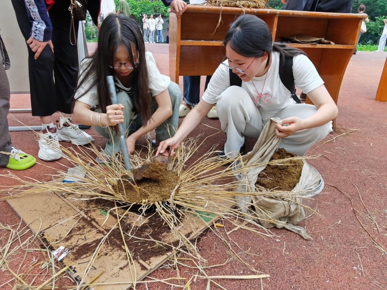 然后,同学们一边压实,一边填料,分工明确地用稻草在箍圈中将茶籽粉捶打结实包饼。